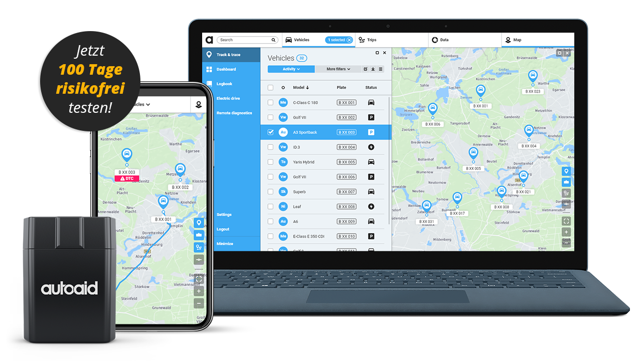 Die Qualität unserer Fahrzeugortung wird Sie überzeugen, und wir bieten Ihnen noch mehr. Mit autoaid erhalten sie wertvolle Telematik-Daten aus Ihren Fahrzeugen, wie beispielsweise Kilometer- und Tankstände, Service-Intervalle und Fehlercodes. Wir bieten Ihnen übersichtlich alle Informationen, um Ihren Fuhrpark noch einfacher und effizienter zu managen. Dabei handelt es sich immer um echte Sensorwerte aus Ihren Fahrzeugen und niemals nur um unpräzise, hochgerechnete Daten. Ermöglicht wird dies aufgrund unserer Erfahrung als Kfz-Diagnose-Anbieter und unserer über 10 Jahre hinweg aufgebauten Datenbank mit mehr als 80 Fahrzeugkommunikationsprotokollen.